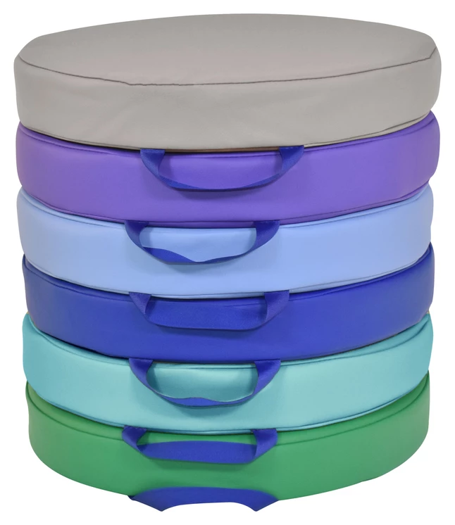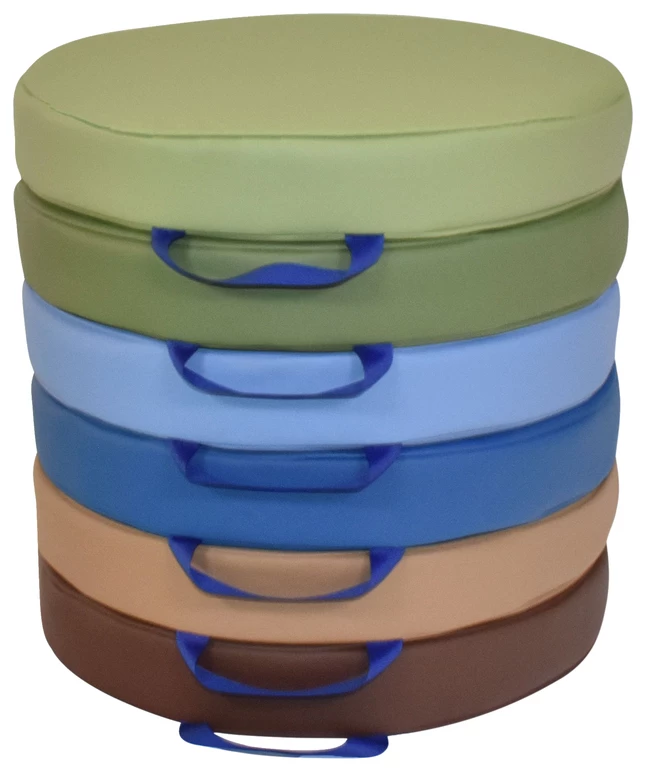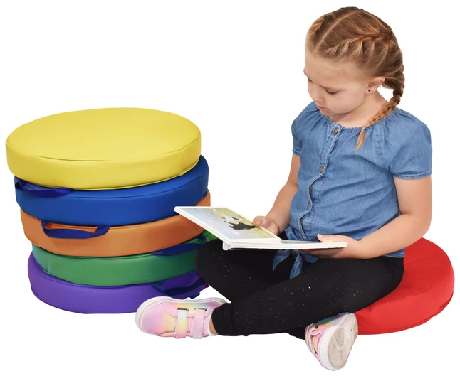 - Round seats with handles allow configurable floor seating anytime and anywhere, for circle time and class lessons to playing cards, board games, and beyond
