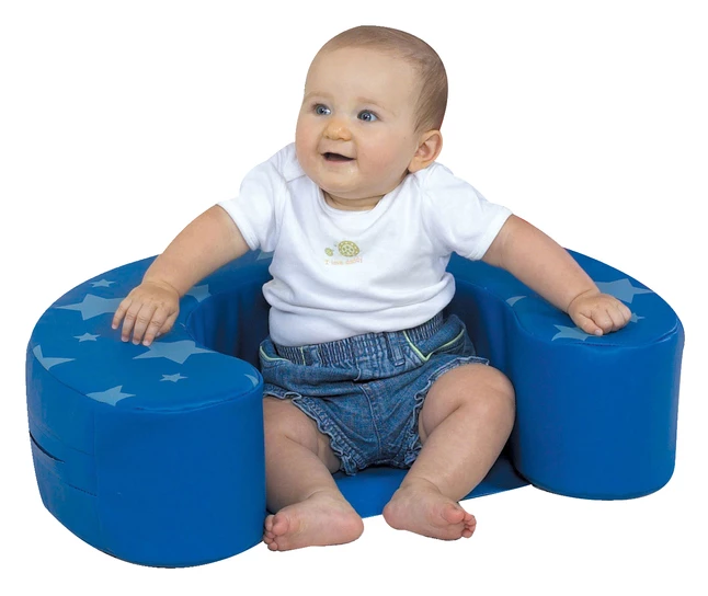 The Sit Me Up provides soft support for special time when baby needs help sitting up. Blue with stars. Dimensions: 24 W x 18 D x 6 H inches. For ages 6 months through 1 year.