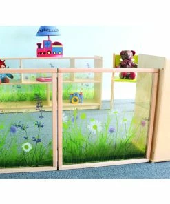 Create a unique nature-inspired toddler area! This 24-inch wide, 24-1/4-inch high room divider panel features a safe, shatterproof clear acrylic panel imprinted with an inviting nature scene that brightens and defines any room environment while providing maximum child visibility and supervision. All corners and edges are rounded over and finished smooth for safety. Use the connector panel accessory [provided] to connect the panel to other pieces in our award-winning biophilia inspired Nature View Collection and create a flexible divided area layout in the warmth of wood without unsightly plastic connectors.