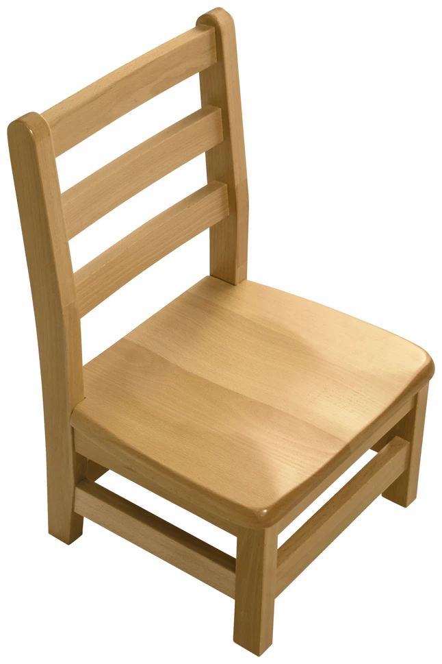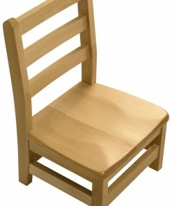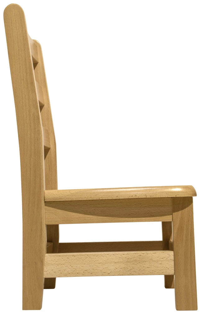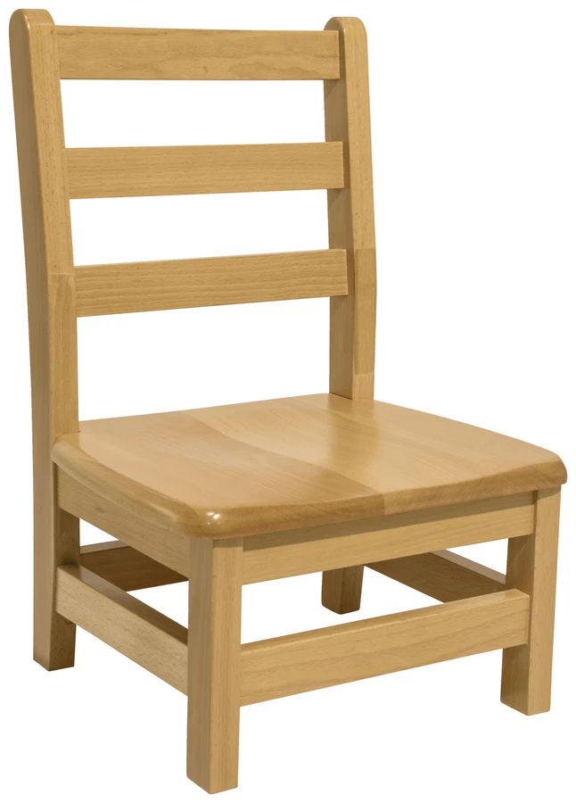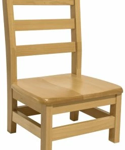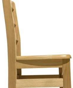 Wood Designs Deluxe Chair measures 14 W x 12-1/8 D x 23 H inches. Constructed using mortise and tenon jointing from solid hardwood. Coated with Tuff-Gloss UV Finish. Curved back legs to minimize tipping backward and rounded corners bring added safety. Set of 2.